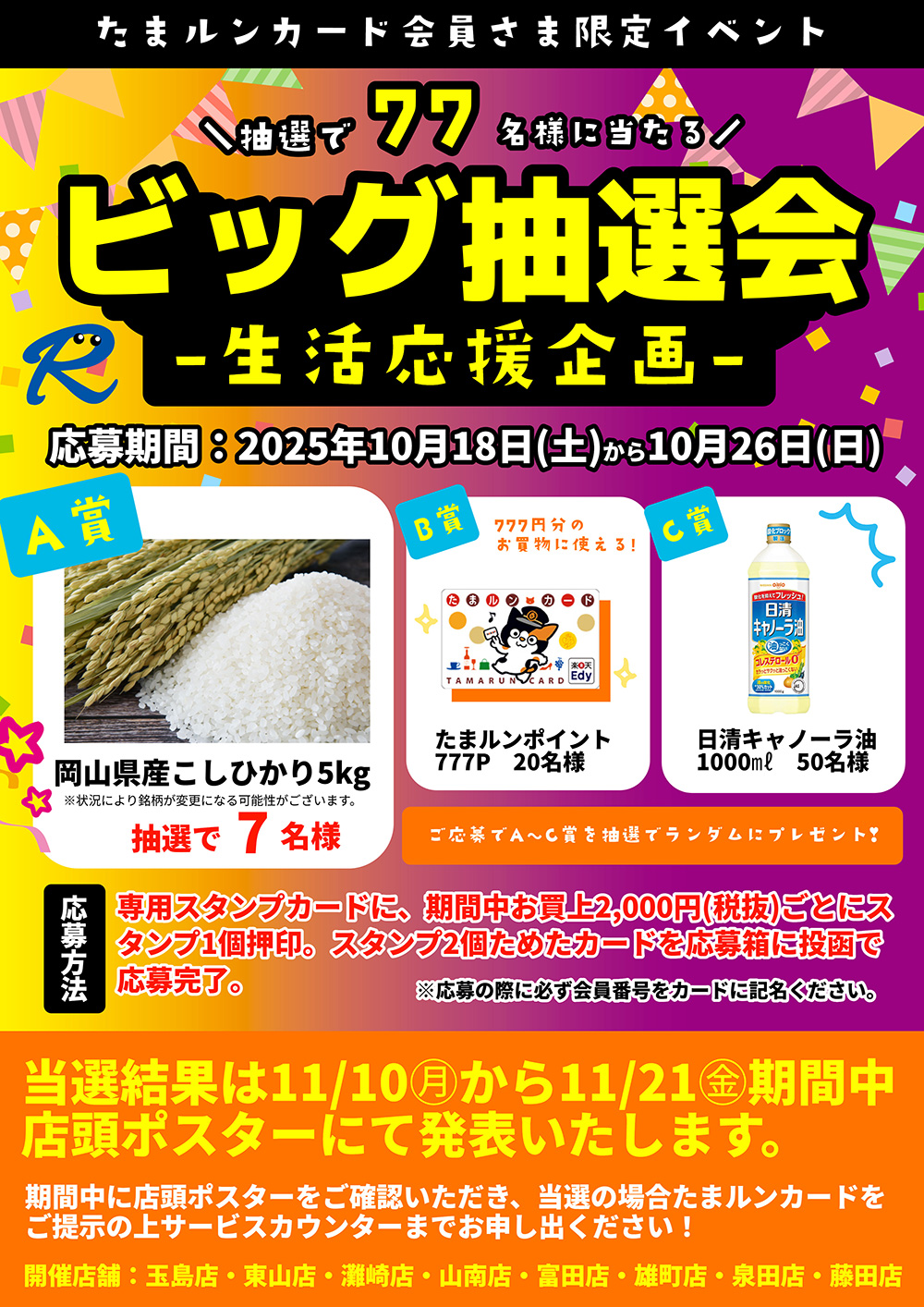 2025/11/10(月)~11/21(金)の期間中に、店頭ポスターにて掲示。当選の方は、たまルンカードをサービスカウンターへお持ちください